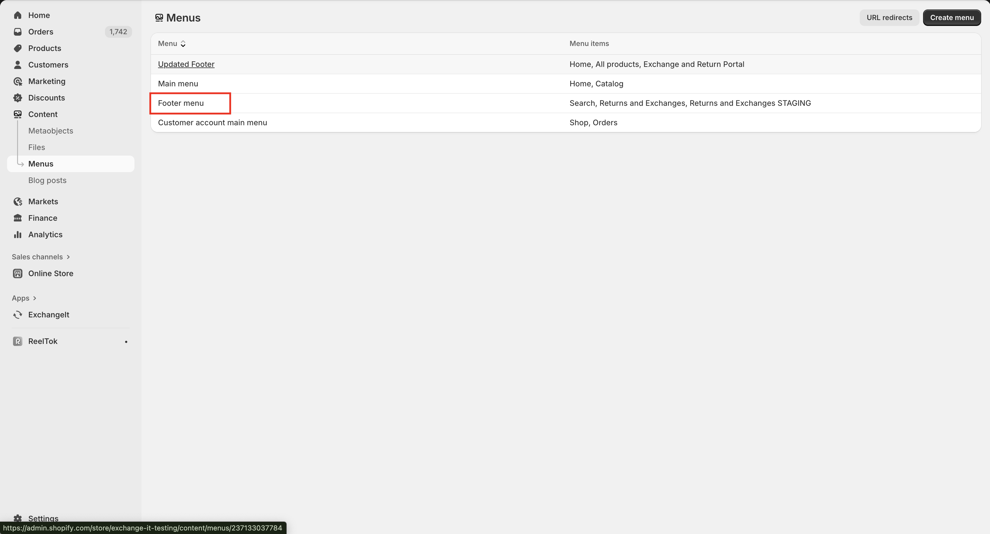 Once on that page, click the “Footer menu” link: