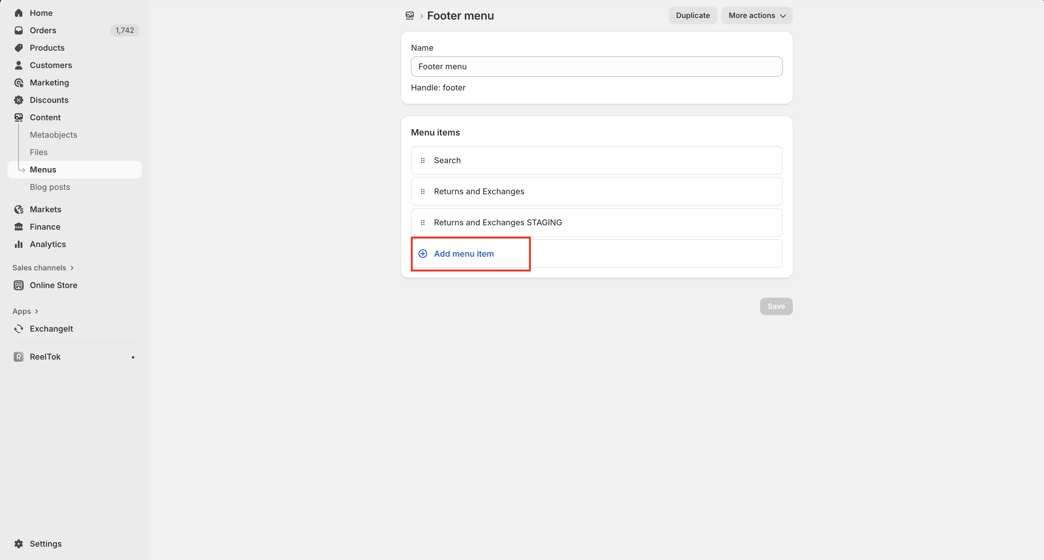 From the footer menu page, click “+ Add menu item”, circled below: