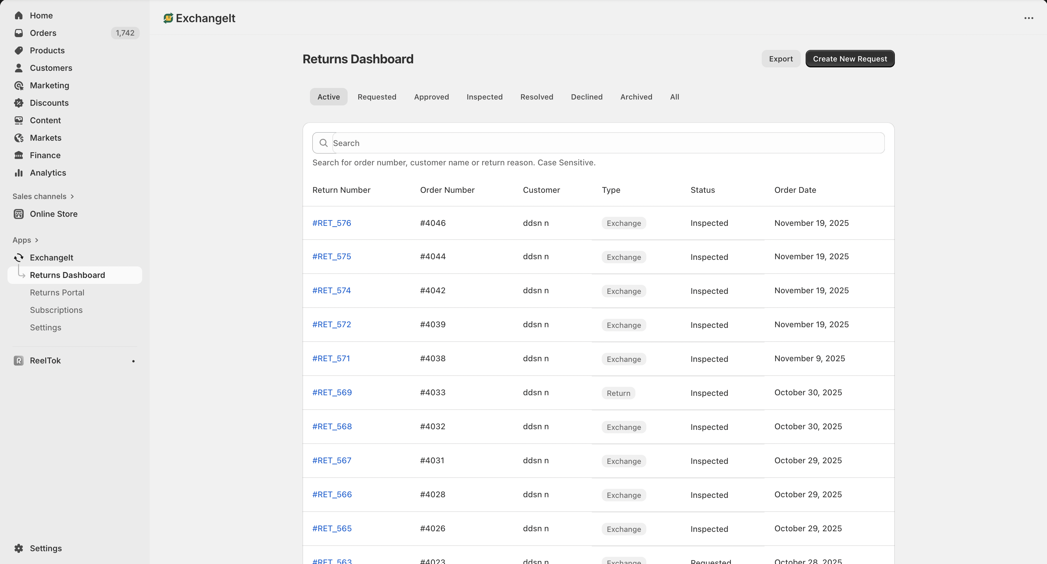 The Returns Dashboard, available to you on Shopify admin, where you’ll either decline or approve and resolve the requests